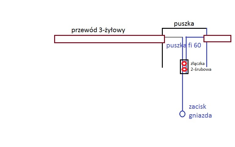 Wprowadzamy do puszki fi 60 głębokiej dwa przewody 3-żyłowe. Jeden od strony zasilania, drugi w kierunku następnych gniazd.