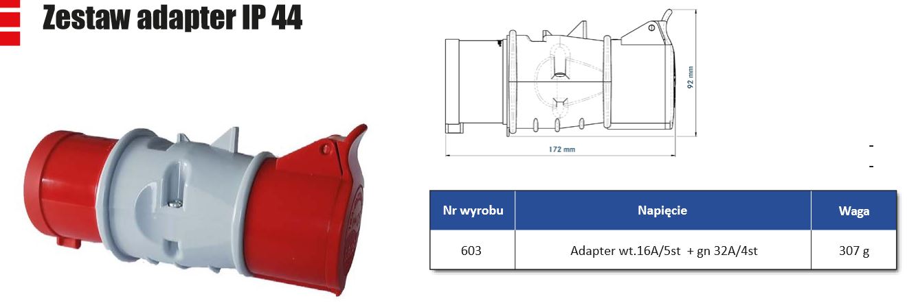 - długotrwałej obciążalności prądowej Adaptera wt. 32A/5st + gn. 16A/5st (nr wyrobu :600). Moje wątpliwości w tym względzie dotyczą możliwości przeciążenia (ze wszystkimi konsekwencjami zwłaszcza cieplnymi) gniazda 400V/16A i przewodów wewnętrznych w Waszym adapterze, gdyż przeznaczony on (adapter) jest do wpięcia w gniazdo 400V/32A, które z wielkim prawdopodobieństwem może być zabezpieczone bezpiecznikami 32A.