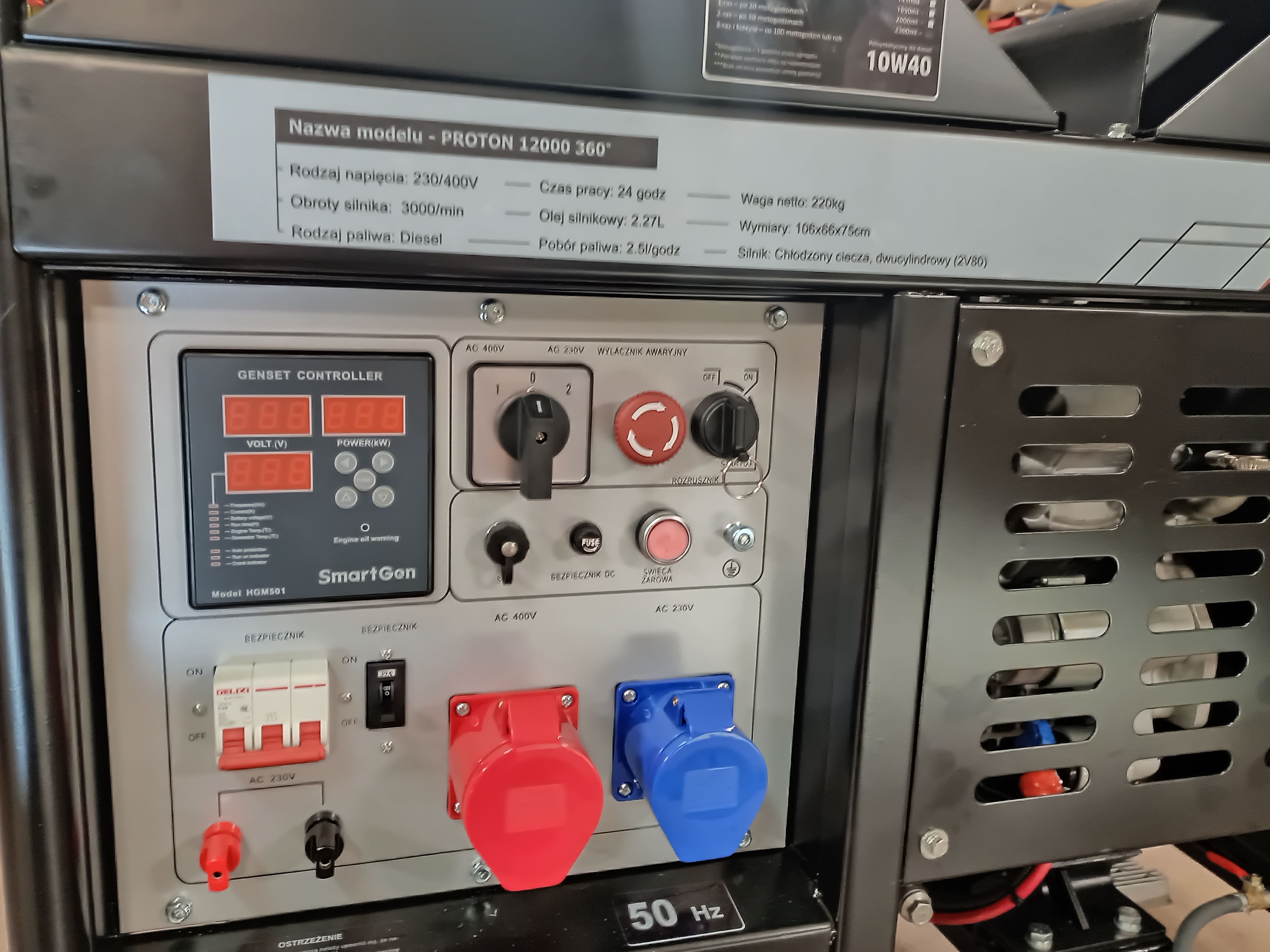 W załączniku nr 3 zdjęcie sprzętu który mam. W ogłoszeniu na Allegro akumulator ma 45Ah a założony jest 30Ah. Kolor naklejki jest żółty a ja mam czerwony. Ułożenie gniazd mam inaczej niż w ogłoszeniu - czerwone z lewej a niebieskie z prawej. I jeszcze sprawa zabezpieczeń która chyba jest istotna. Według karty katalogowej zabezpieczenia są następujące: C25-400V i C50-230v. Nie powinien mieć tych zabezpieczeń więcej przy tej funkcji Dual Power?