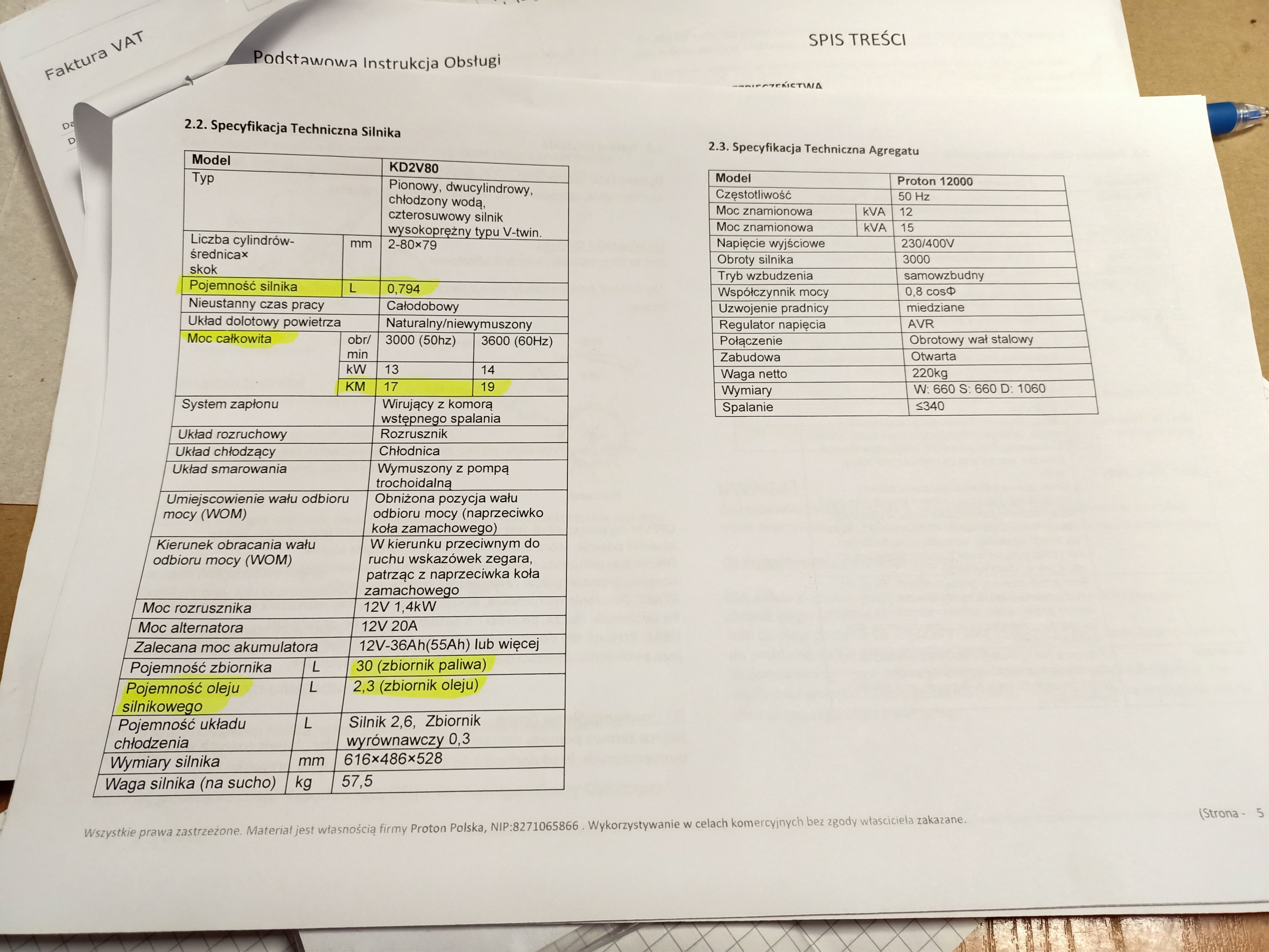I sprawa wygląda tak że nie nie jestem pewna czy otrzymałam faktycznie to co kupiłam i czy agregat ma tą podwójną moc. W “Podstawowej instrukcji obsługi” dołączonej do agregatu (zał. nr 1) specyfika techniczna różni się od parametrów podanych na allegro - waga, wymiary, pojemność zbiornika paliwa i oleju a przede wszystkim POJEMNOŚCIĄ SILNIKA i MOCĄ.
