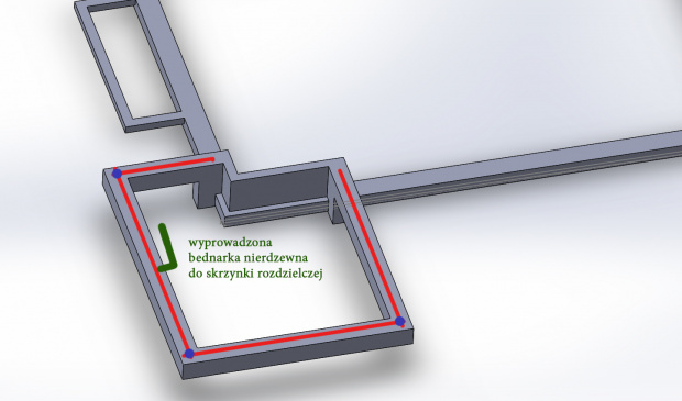 Wyprowadzona i pospawana bednarka nierdzewna do wnętrza budynku do skrzynki rozdzielczej w garażu (szyny wyrównawczej?):