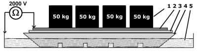 Chodnik dielektryczny (4) zanurzamy (do góry nogami) w wannie z wodą z solą (5), nakładamy nawilżony materiał przewodzący (3), następnie blachę (2), obciążamy ciężarem 200 kg (1) i wykonujemy pomiar rezystancji napięciem 2 kV.