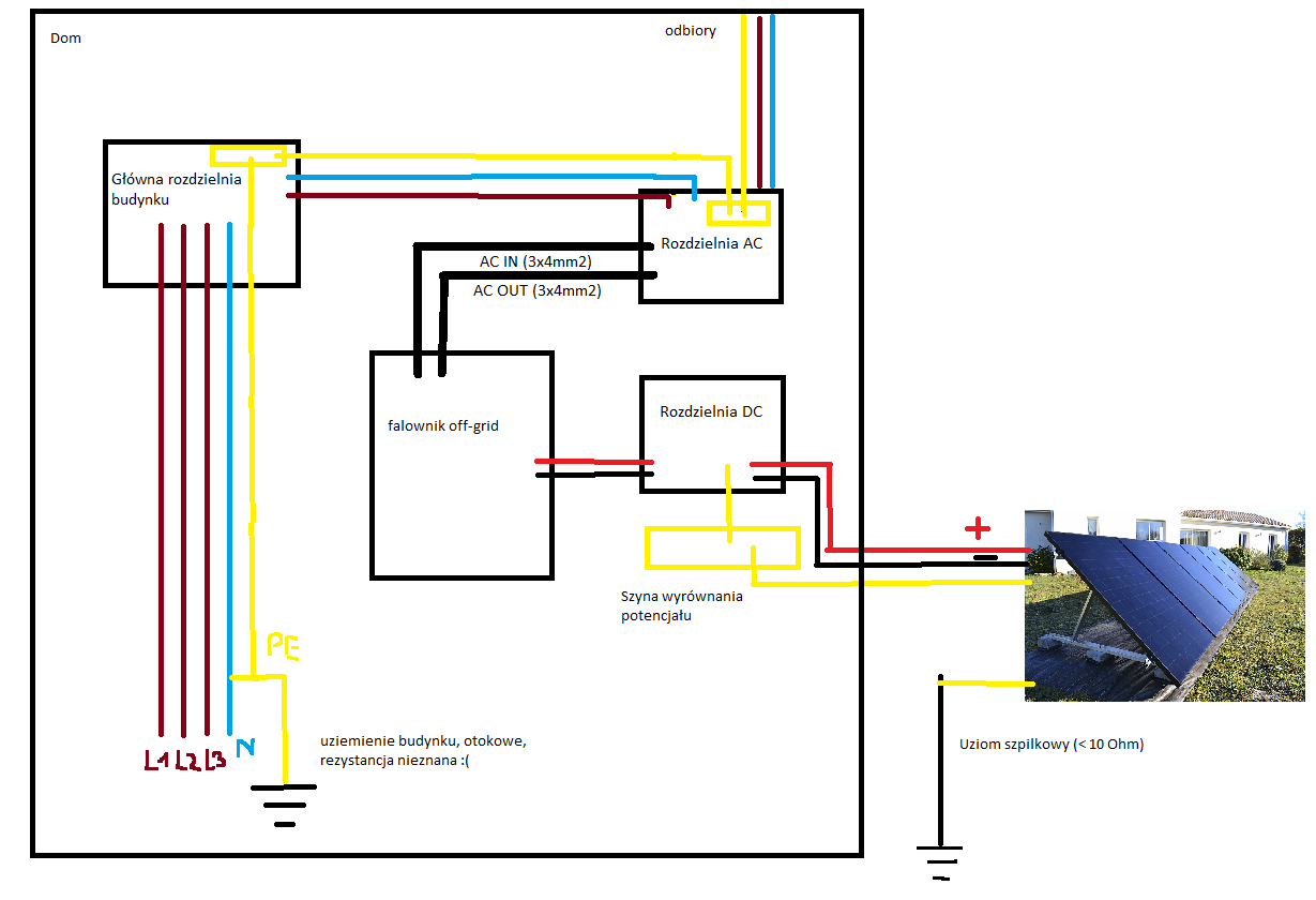 W tym momencie są dwa oddzielne uziemienia, jedno dla konstrukcji PV i ogranicznika przepięć DC i drugie to uziemienie domu.