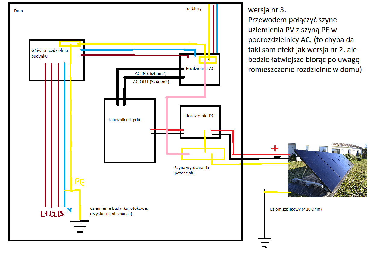 Pytałem trzech elektryków (jeden dodatkowo monter PV) i każdy mówi co innego, podpytałem znajomych, którzy mają instalacje ON-grid i nikt nie ma połączonych tych uziomów.