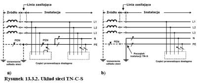 Na rysunku 13.3.2.a) przedstawiono układ sieci mieszanej TN-C-S, w której urządzenia w instalacji odbiorczej jednego obiektu są zasilane dwoma sposobami. Instalacje takie występują w przypadkach częściowych modernizacji instalacji jednego obiektu.