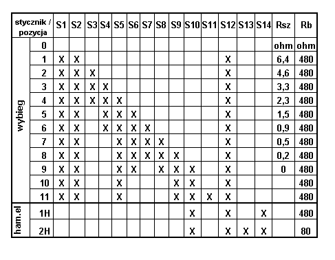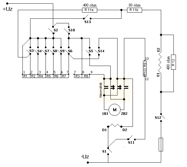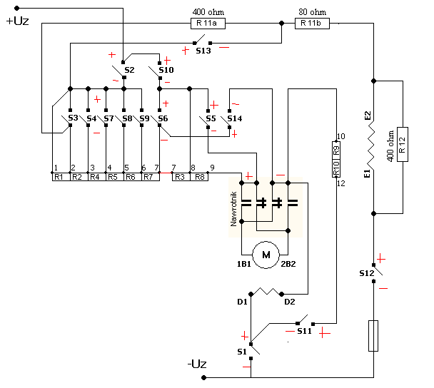 Z praktyki i pomiarów wiem, że prąd w obwodzie wirnika płynie w przeciwną stronę. Napięcie zasilania 660V, prąd wirnika od 0 do około 250A w obwodzie głównym i prąd bocznikowy znamionowy ok. 3A. Ale dalej jest zagadką dla mnie, że przy otwartym styczniku S1 prąd w obwodzie wirnika wynosi do 200A. Jak zamyka się ten obwód w fazie hamowania? Druga sprawa to sekwencje styczników. Np pozycja nr.9 wybieg. Czy ma znaczenie, że styczniki S2, S8, S9 są zamknięte? Przecież obwód się zamyka przez S10, S5, wirnik i S1. Obwód bocznikowy przez S10, S6, R2, R4, R5, R6, R7, R11a, R11b, cewkę bocznika i S12. Wiem, że w mojej teorii jest gdzieś błąd, ale gdzie?
