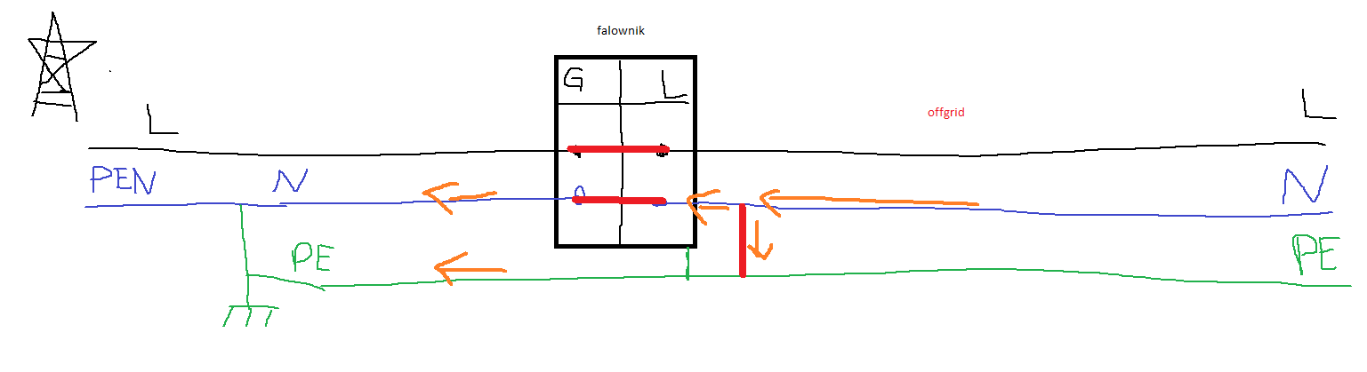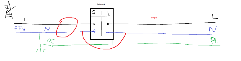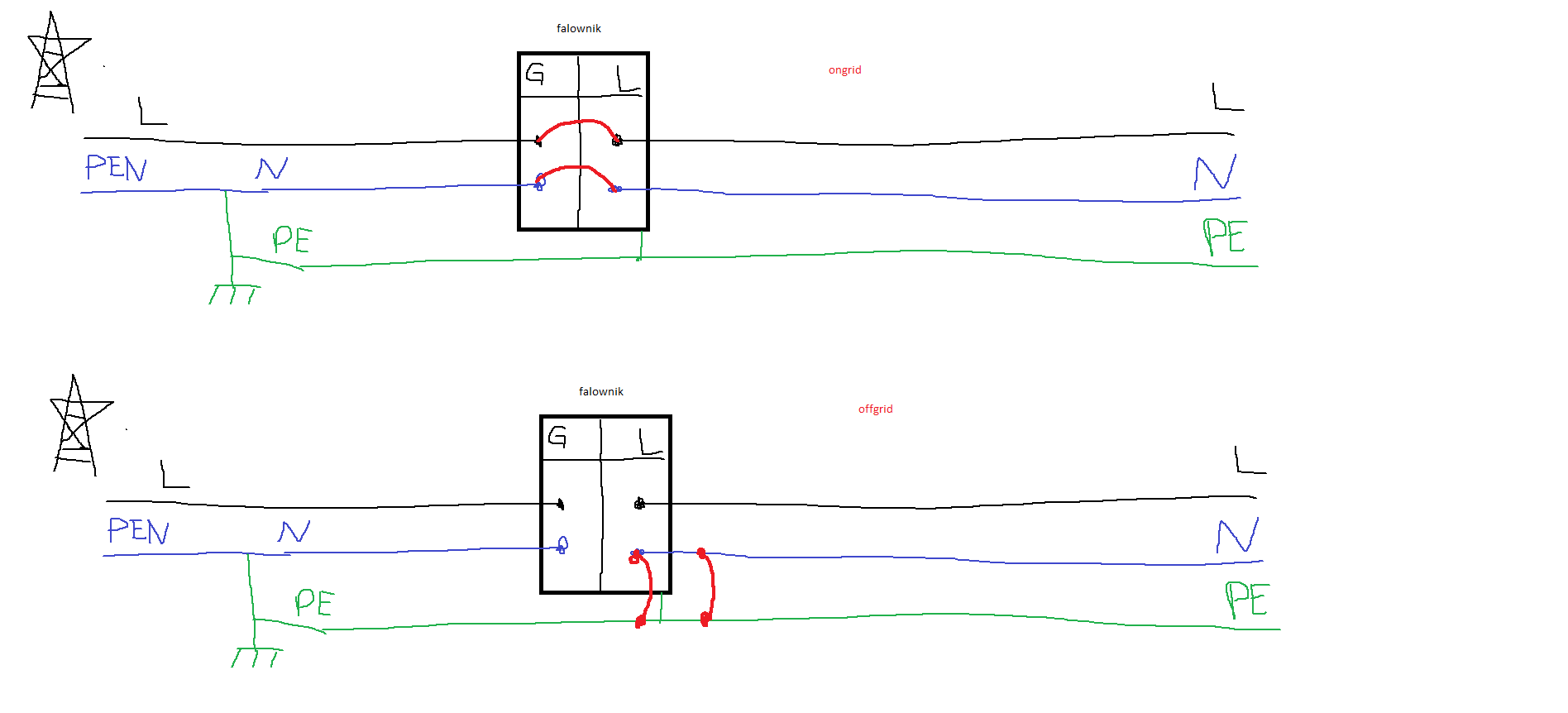 Może na początek wyjaśnię ponownie w czym problem, oraz jak się mają wnioski po jakby nie patrzeć 2 stronach dyskusji. Przede wszystkim budowa falownika. Falownik ma 2 wyjścia obsługujące sieć AC. GRID oraz LOAD. Do strony GRID podłączamy zasilanie z sieci energetycznej, a od strony LOAD podłączamy obwody odbiorcze, oczywiście przez rozdzielnicę. W trybie pracy ongrid falownik wewnętrznym stycznikiem zwiera Nki i Lki między GRID i LOAD, dzięki czemu na wyjściu mamy stałą fazę oraz N podłączony do ziemi. W momencie zaniku napięcia w sieci energetycznej (tryb offgrid) falownik odłącza wcześniej wspomniany stycznik, dzięki czemu wyjście LOAD pracuje w układzie IT, ale ma on też wbudowany przekaźnik który w tym momencie zwiera N wyjścia do PE. Teoretycznie tym przekaźnikiem nie płynie prąd, prócz zwarć L-PE na wyjściu, a obsługę tego przekaźnika można wyłączyć.