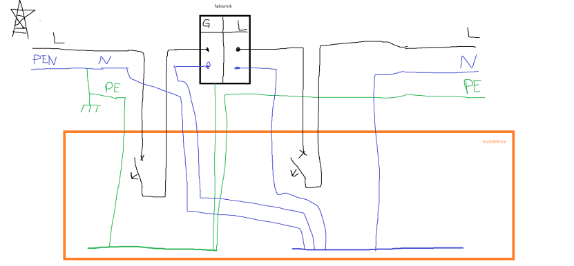 Kombinowałem nad innym rozwiązaniem problemu, mianowicie nad czymś w rodzaju podziału PEN za falownikiem. Czyli nie bawimy się w styki i styczniki bo jako że nie mamy już N i PE i nie ma groźny ich połączenia, to możemy wszystko połączyć na stałe. Zastanawiam się tylko jak połączyć przewody ochronne i neutralne by miało to ręce i nogi.