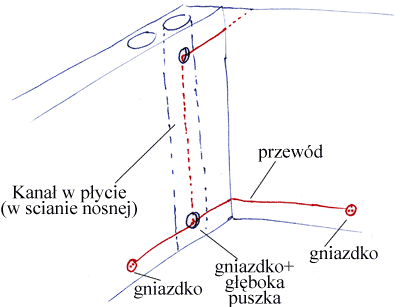 W mieszkaniu, w którym postanowiłem wymienić instalację na trójprzewodową, wszystkie przewody zalane są w podłodze, nie ma mowy o ich wymianie. Musze położyć nowe przewody. Męczę się z tym strasznie, bo ściany są twarde jak skała, a do tego co jakiś czas mają w sobie pręty. Wiercąć otwór na puszkę pod gniazdko natrafiłem na kanał idący wewnątrz ściany nośnej. Chciałbym sobie zaoszczędzić robienia pionowej bruzdy na tej scianie i wpuscic przewod w ten kanał.