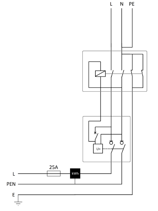 Wyzwalacz nadnapięciowy otworzy rozłącznik dwubiegunowy (dwubiegunowy bo na PEN-ie może być niebezpieczne napięcie więc nie chcemy jego ciągłości). Niestety mamy w tym przypadku przerwany przewód ochronny i na urządzeniach może być nadal niebezpieczne napięcie / ładunek, więc stycznik pozbawiony napięcia na cewce również rozłączy L i PEN, ale w zamian tego za pomocą styków rozwiernych uziemi przewód PEN.