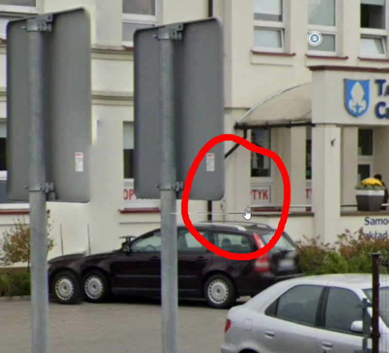 Bardzo dobrze, że nie widzisz. Pomiarowiec tez nie widział. “Na tle” prawego znaku drogowego, wzdłuż rury spustowej rynny jest zwód pionowy i wejście do budynku.