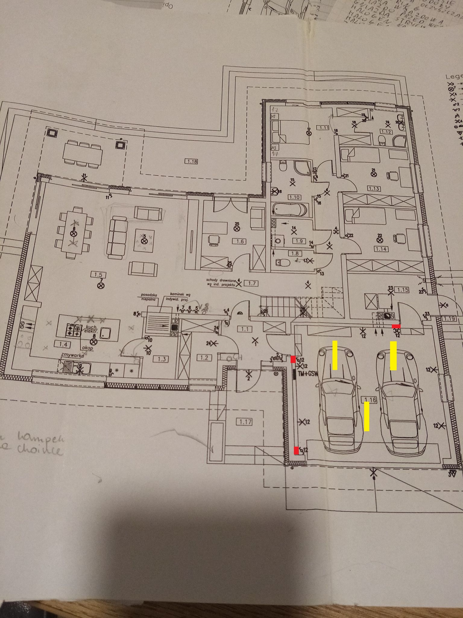 Na czerwono łączniki światła, na żółto świetlówki + będą jeszcze dwa czujniki ruchu.