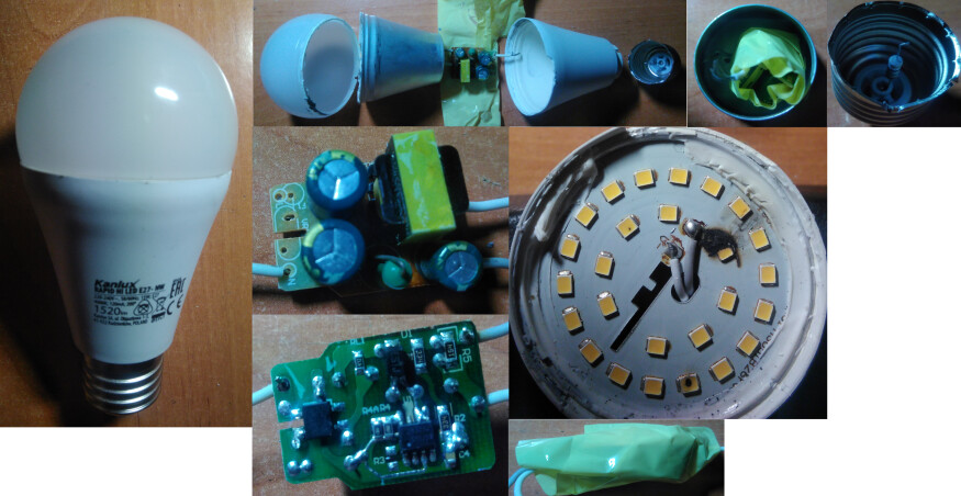 Lampa LED Kanlux, po ok. 1500h pracy (2x1h/dobę, ok. 2 lata) padła. Moc lampy: 15W, na trzonku E27. Przyczyna: wypalenie na płytce z diodami LED, przegrzanie. Korpus jest wykonany z tworzywa sztucznego, wewnątrz aluminiowy “radiator”, płytka pod diodami jest aluminiowa, pokryta warstwą izolacyjną, na której są ścieżki obwodu drukowanego. Zasilacz jest zawinięty w taśmę, podobną do taśmy do pakowania. W trzonku jest rezystor, o niewielkiej rezystancji ok. 1om, ogranicza on prąd rozruchowy lampy (prąd ładowania kondensatorów obwodu pośredniego zasilacza) oraz jest “bezpiecznikiem”. Spotkałem lampy, w których padł zasilacz i ten rezystor ulegał wypaleniu. Producent deklaruje żywotność lampy 20000h. Lampa pracowała w pomieszczeniu o normalnej wilgotności i temperaturze pokojowej, w oprawie z kloszem, zamkniętej.