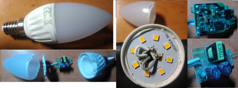 Lampa LED Lumax, po ok.3000h pracy padła. Moc lampy 5,5W, na trzonku E14. Przyczyna: przegrzanie, uszkodzenie jednej diody LED (dioda z ciemnym punktem). Korpus lampy jest ceramiczny, płytka z diodami LED aluminiowa, pokryta warstwą izolacji a na niej ścieżki obwodu drukowanego. Zasilacz umieszczony w korpusie. Producent deklaruje żywotność lampy 30000h. Lampa pracowała w pomieszczeniu o normalnej wilgotności i temperaturze pokojowej, w oprawie z kloszem, otwartej.
