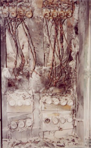 Są to zdjęcia rozdzielni niskiego napiecia (starego typu ) spalonej w wyniku przegrzania podstawy bezpiecznikowej w dolnej części szafy. Awaria wystąpiła na skutek naprawienia bezpiecznika żyłą 0,75mm2 przez użytkownika. Na zdjęciach nie ma już liczników - a szkoda.