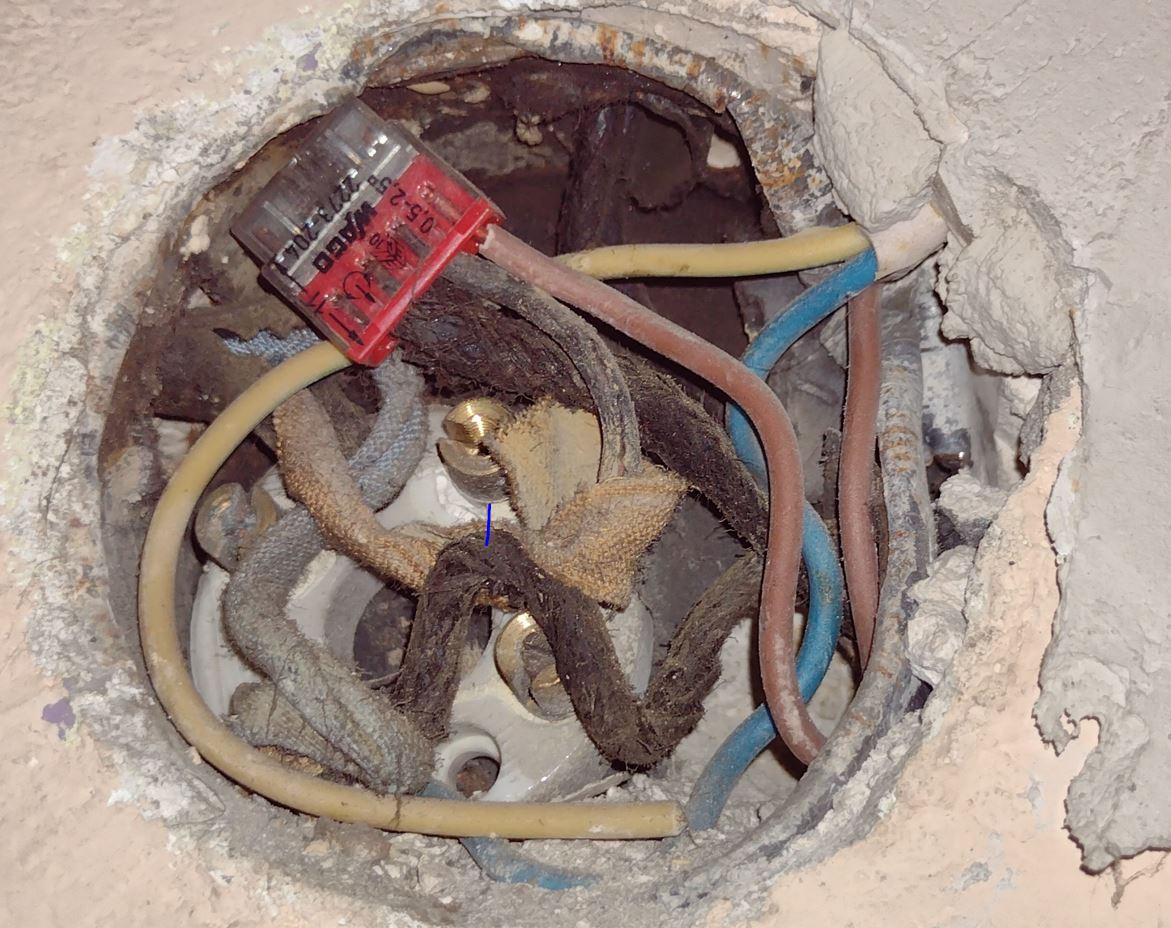 Szczerze wątpie aby robił to elektryk widząc stan tych przewodów w gumie w oplocie bawełnianym oraz metalową puszką,