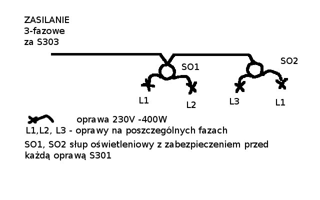 Mam problem z obliczeniem spadku napięcia gdy mamy zasilanie 3-fazowe powiedzmy YKY 5x4mm2 a poszczególne fazy są rozbite na odbiorniki 1-fazowe (np. jak w załączniku). Zasilanie za S303 lub 3xS301 a dodatkowo przed np. oprawami oświetleniowymi dodatkowo zabezpieczenie każdej oprawy S301 i dalej YKY 3x1,5mm2. Obciązenie jest “trochę” niesymetryczne, więc nie wiem, czy mogę to traktować wzorem na spadek 3-fazowy dla YKY 5x4 i wrzucić moc całkowitą zainstalowaną nie ważne czy na bliższym czy dalszym słupie a dalej juz do poszczególnych opraw jako spadek 1-fazowy?? Bo liczenie dla żdej fazy osobnego spadku napiecia tylko dla opraw zasilonych z danej fazy przy dodatkowo ujęciu czy dana oprawa jest bliżej czy dalej to chyba zbytnie zaglębianie sie??