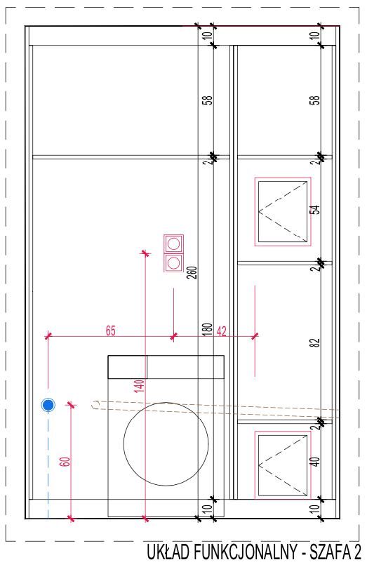 Lokalizacja pralki planowana w zabudowie meblowej w oddzielnym korpusie niż skrzynki.