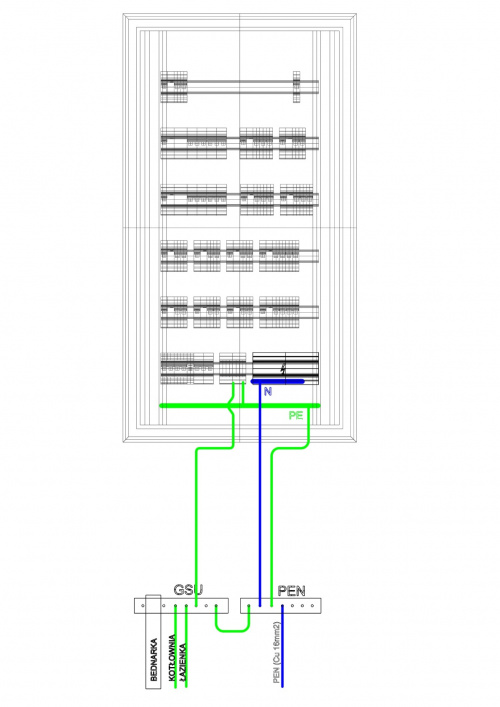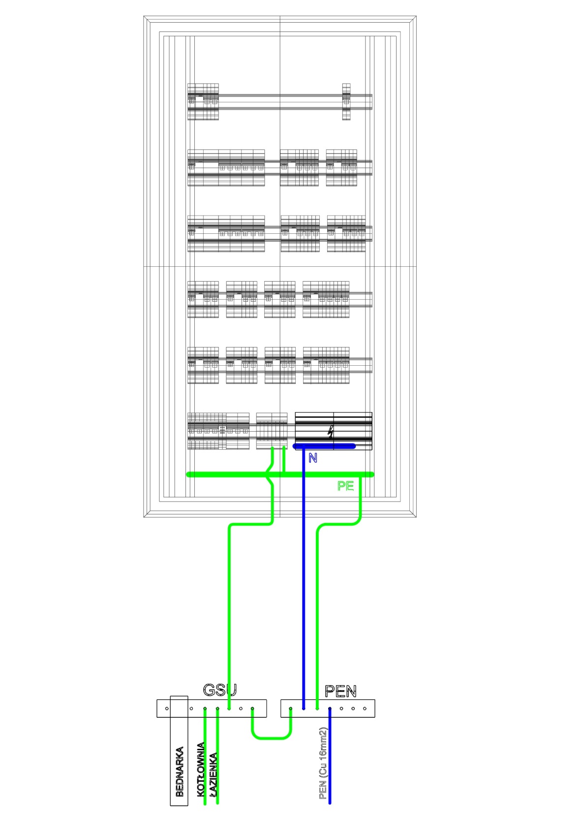 Podział PEN jest w budynku pod rozdzielnicą, wygląda to tak jak na załączonym rysunku.