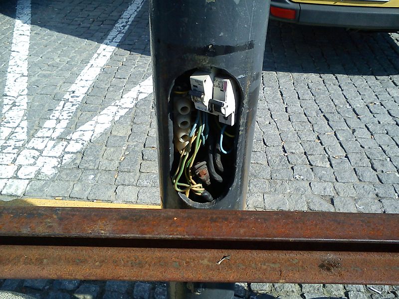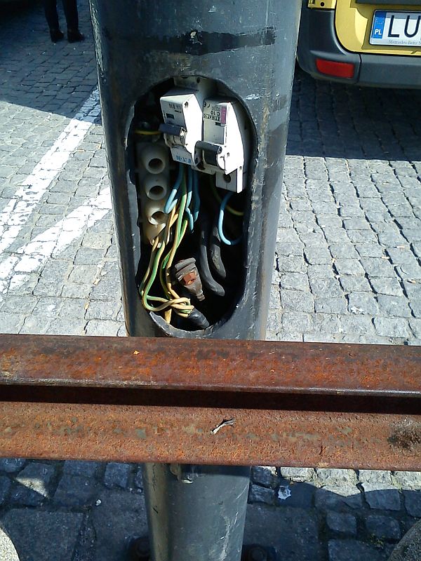 Ile ja się takich rzeczy naoglądałem, jeżdżąc po miastach… w pierwszym wypadku trzeba będzie się pewnie dowiedzieć, kto jest właścicielem tych lamp i zawiadomić o zagrożeniu publicznym; w drugim to jest dom prywatny?