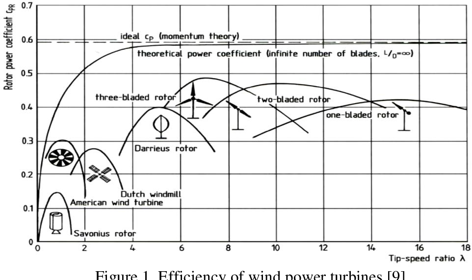 Wyżej sprawność turbiny w zależności od jej rodzaju oraz stosunku prędkości końcówki łopaty do prędkości wiatru. Do tego doliczmy typowe prędkości obrotowe turbin różnego typu i dochodzimy do pięknych wniosków, że najwięcej sensu mają turbiny trójłopatowe, bo mają bardzo dużą efektywność w dosyć szerokim spektrum prędkości wiatru który jest jeszcze użyteczny, czyli prędkości średnie i duże. Walka o sprawność przy niskich prędkościach wiatru nie ma sensu bo i energii z tego nie ma wiele, oraz przy wiatrach bardzo dużych bo trudno zaprojektować taką turbinę by jej nie połamało.