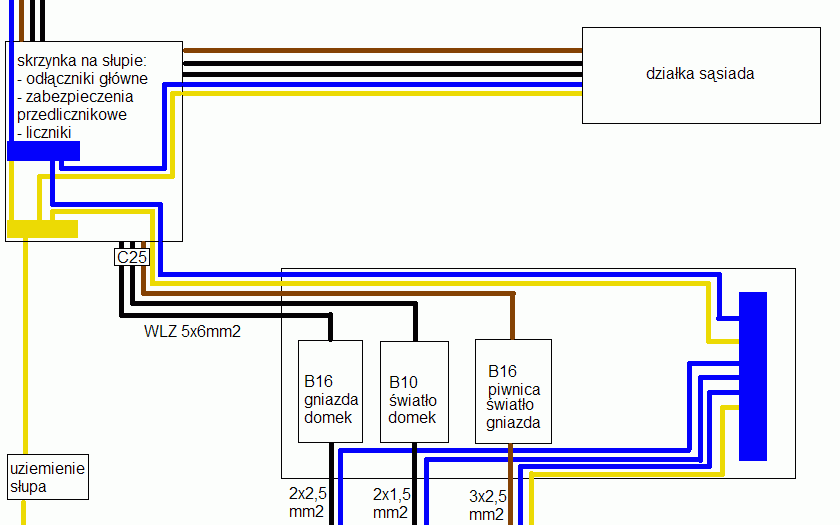 - Wychodzą z niej dwa kable 5x6mm2 jako WLZ i idą do mojego domku i do sąsiada