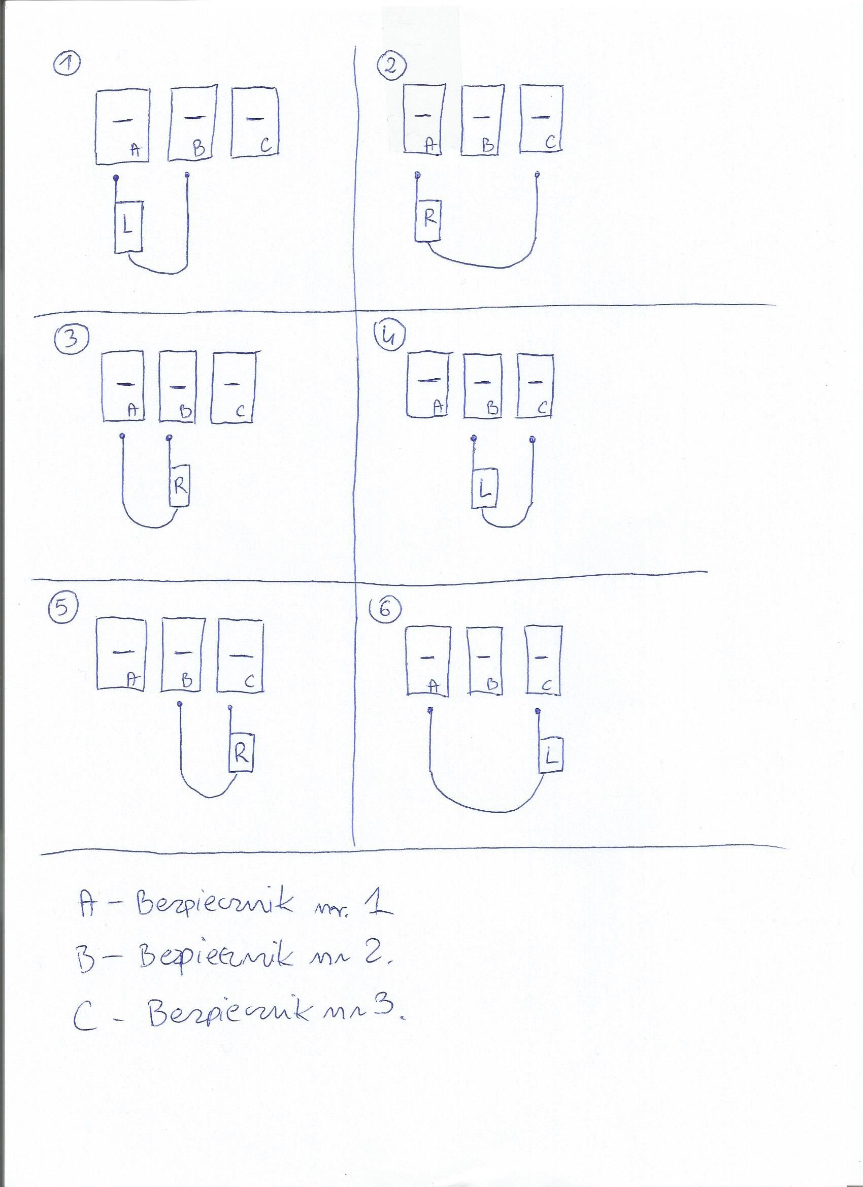 Poniżej przedstawiam prosty rysunek, według którego wykonałem 6 pomiarów w różnych kombinacjach moim wskaźnikiem napięcia, i teraz mam do was pytanie w jakiej kolejności powinienem podłączyć silnik jak bym miał podłączyć go do bezpiecznika A,B,C i dla czego tak a nie inaczej.
