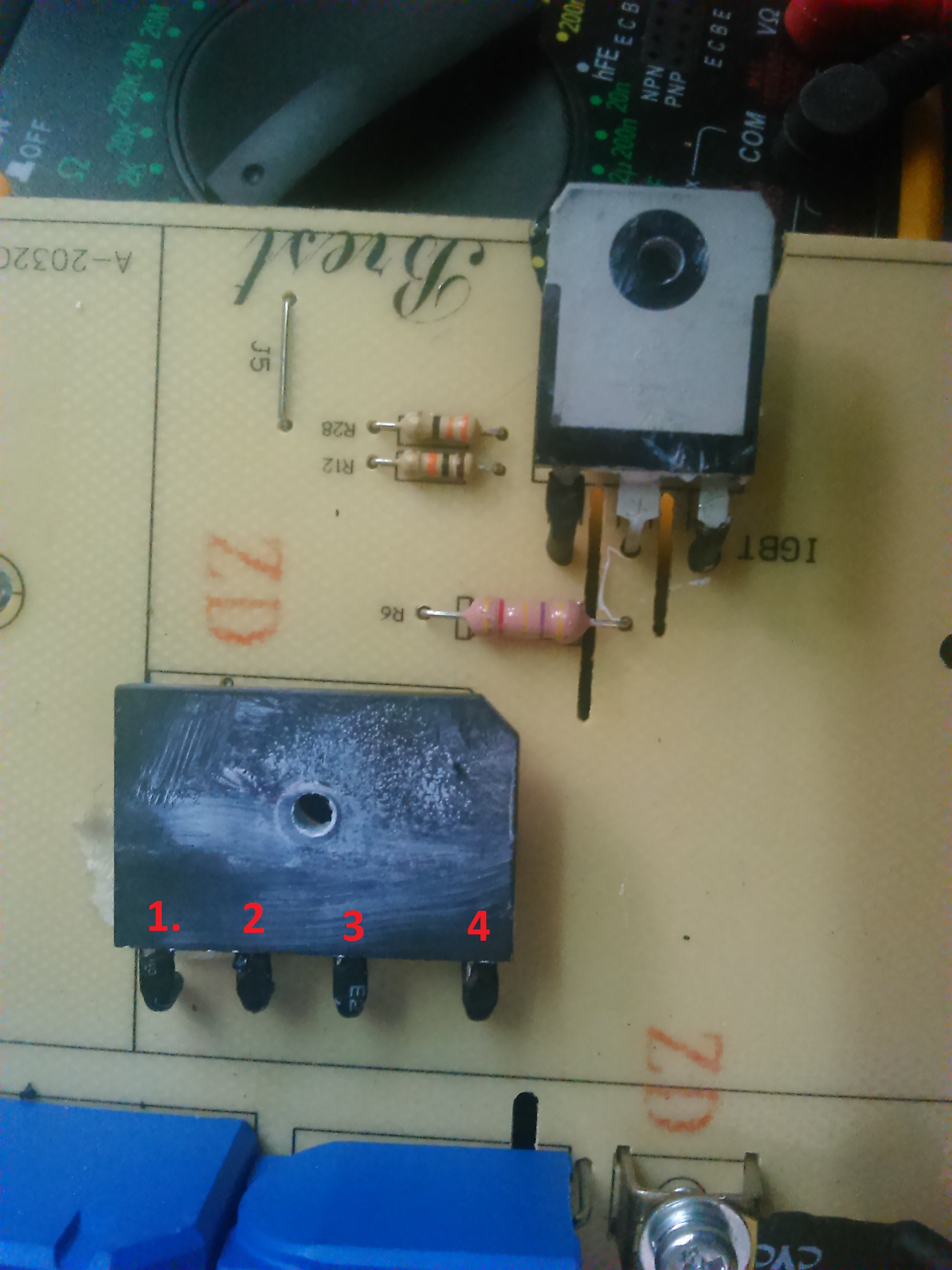 Mam pytanie, więc proszę o wyrozumiałość. Z tej racji że się uczę, jak mogę sprawdzić czy kondensator IGBT jest sprawny? Czy miernik uniwersalny wystarczy? Kiedy ustawiam na mierniku zakres diod, przy każdym podłączeniu miernika jest piszczenie, a przy sprawdzaniu mostka prostowniczego piszczenie pojawia się przy podłączeniu miernika do dwóch połączeniach, które podpisałem na tym zdjęciu numerami.