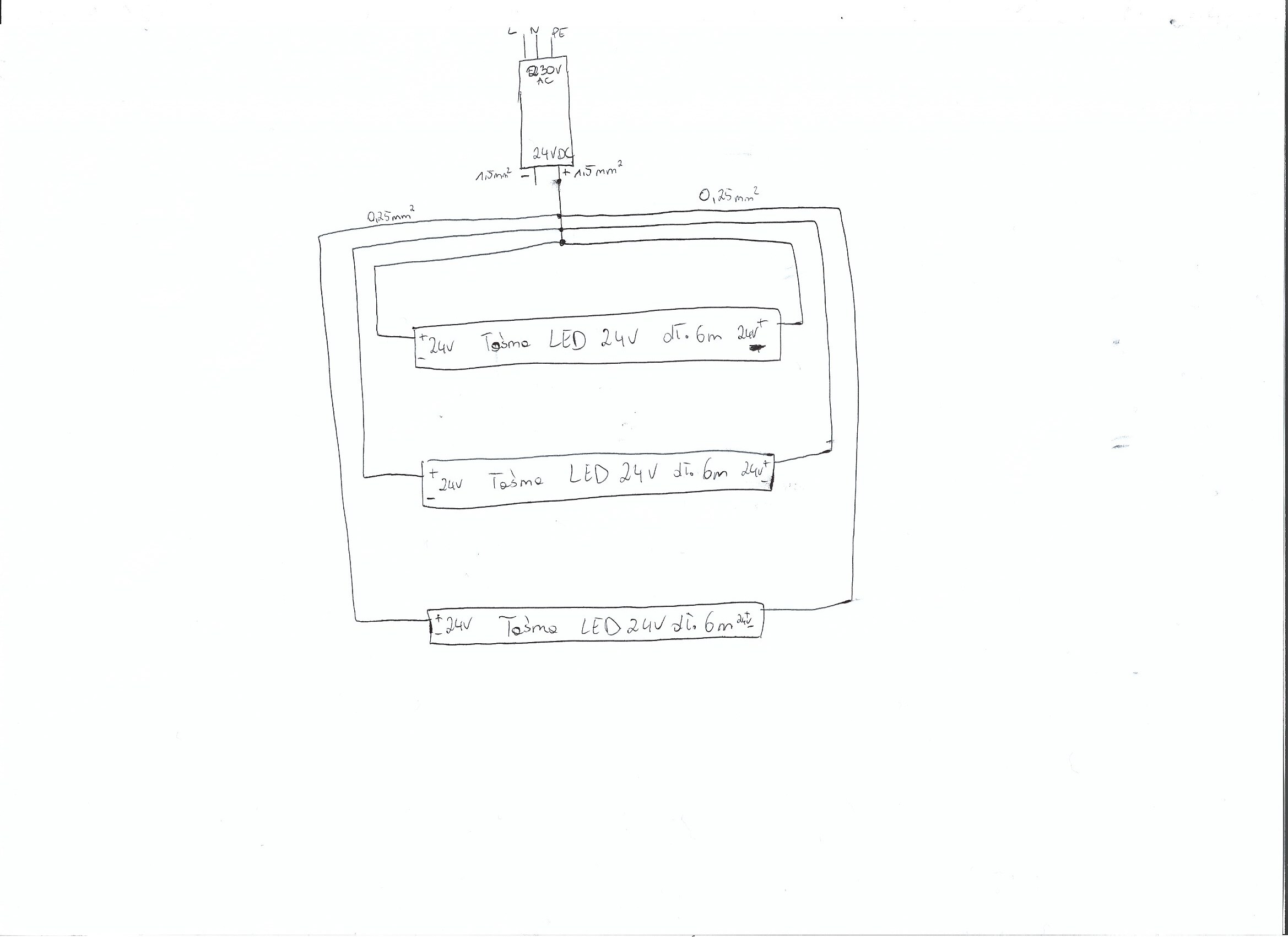 Czy jeżeli zasilę każdą taśmę tylko z jednej strony, to czy nie skróci się automatycznie trwałość takiej taśmy? Jeżeli chodzi o świecenie, to na początku i końcu taśma LED świeci praktycznie identycznie. Wyczytałem, że spadki napięć przy 24V zaczynają się dopiero przy 9m, ale jakbym zasilił każdą taśmę równolegle, czyli podał na początek i koniec taśmy zasilanie z wyjścia zasilacza, to nie byłoby to lepsze rozwiązanie? Z zasilacza wychodzi przewód 2x1,5mm2 i wchodzi do puszki, do puszki hermetycznej wchodzi każda taśma osobno (z każdej taśmy wychodzi przewód 2x0,25mm2 i zastanawiam się czy przy odcinku przewodu 3,5-5m nie będzie za mały przekrój)? Chciałbym aby ktoś z Państwa wypowiedział się i prosiłbym też o argumenty. Jeżeli się mylę, to również proszę o wypowiedź. Dodaję załącznik (Jest zrobiony schemat, na schemacie jest wszystko rozrysowane jak chciałbym aby to było połączone, nie podłączyłem minusa, bo chcę żeby rysunek był bardziej czytelny). Wiem jak łączyć LEDy, ale tutaj chodzi mi głównie o długość tej taśmy, zastanawiam się po prostu czy nie zasilić jej z dwóch stron żeby odciążyć leda na początku i żeby prądy rozłożyły mi się równomiernie?