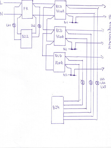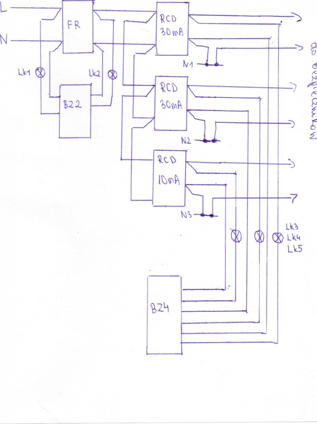 Kontrolki będą sygnalizowały obecnośc napięcia przed FR-em, za FR-em, oraz za każdym RCD.