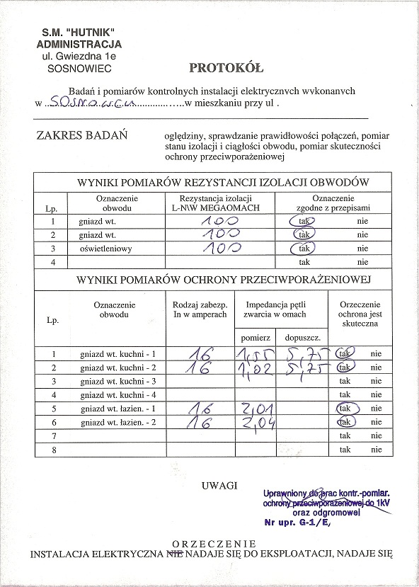 Kolego elpapiotr extra protokół z przeprowadzonych prac kontrolno-pomiarowych.Szczególnie, pomijając sam protokół wygląda pieczątka osoby która sporządziła tenże “protokół”. Dupochron jest otworzony.Gość ma super układy w tej spółdzielni.Brak podstawowych danych osoby+nr uprawnień, po których można by było ustalić osobę.Ale kto zwraca uwagę na pieczęć w układzikach… Dla zarządzającego w razie nieszczęścia prokurator może zarzucić jedynie niewiedzę. Przecież pieczęć jest i nawet nieczytelny podpis.