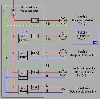 Norma zabrania stosowania RCD w TN-C ze względu aby nie dopuścić do przerwania PEN dlatego narysowałem RCD JVL-5, który nie przerywa PEN.