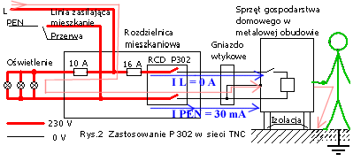 Pozatym RCD o prądzie różnicowym do 30mA zainstalowany w takich obwodach (tych z prezentowanych z rysunków) nie pełni roli urządzenia realizującego Samoczynne Wyłączenie Zasilania w układzie TN-C (Kolega Krystyn używa moim zdaniem błędnego określenia Samoczynne Szybkie Wyłączenie, ale mniejsza o to) lecz rolę uzupełnienia ochrony przed dotykiem bezpośrednim (czego ja nie zabraniam pod warunkiem, że jest to właściwie zrealizowane a nie zawsze na tych rysunkach jest), i to jest zupełnie coś innego niż TN-C. Gdyby w takim obwodzie był prawdziwy układ TN-C RCD wyłączał by obwód przy sprawnym urządzeniu. Dlatego też nie należy używać dla tych obwodów określenia RCD w TN-C ponieważ takimi nie są.