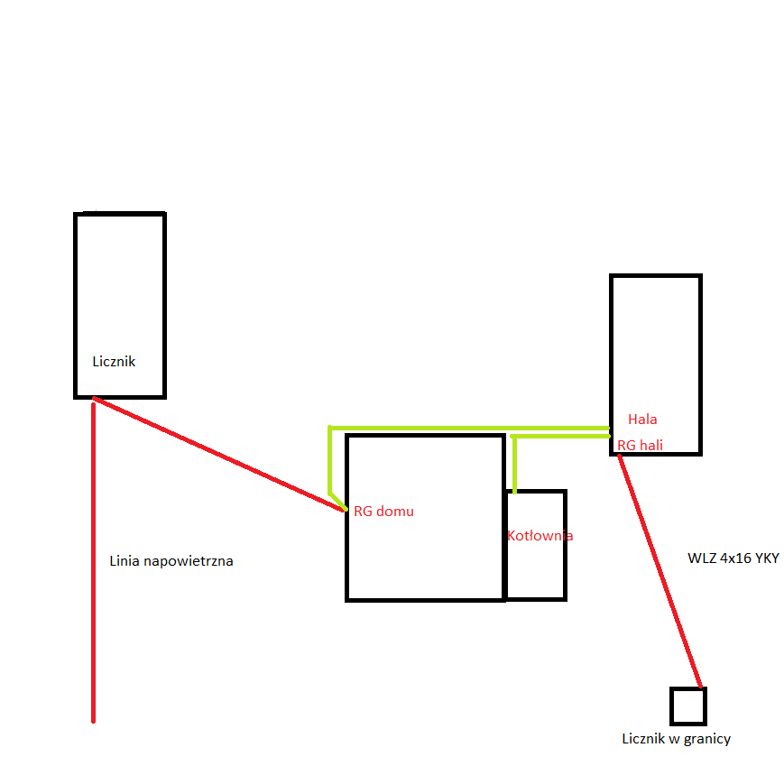 Ja na przykład patrząc na rysunek, nie wiem jak rzeczywiście to wygląda, wolałbym od nowego wlz/licznika w granicy, pociągnąć równolegle 4x16mm2 Cu do kotłowni, pominąć halę, w kotłowni zrobić rozdzielnicę i z niej wyjść np. 4x10mm2 po zew. str. na dom, bo i tak będziesz tak szedł z hali lub odwrotnie, najpierw na dom i z niego na kotłownię. Uziom zrobić otokowy dookoła i z niego wyjść na dom i kotłownię.
