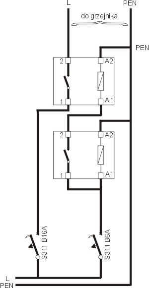 Następnie podłączasz do pieca przewód PEN z instalacji a przewód fazowy L prowadzisz poprzez styki zwierne.