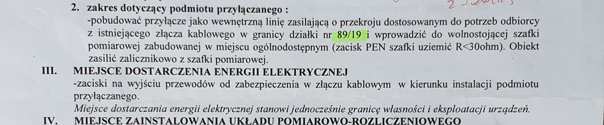 Inwestor dostał warunki na tymczasowe przyłącze (RB z miejscem na układ pomiarowy), które ma być poprowadzone z ZK-1 na sąsiedniej działce.