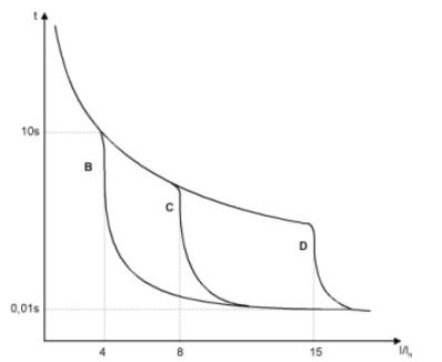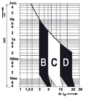 C - przedział działania wyzwalaczy 5 - 10 In (zabezpieczenie urządzeń o dużych prądach rozruchowych: silniki, transformatory, źródła światła),